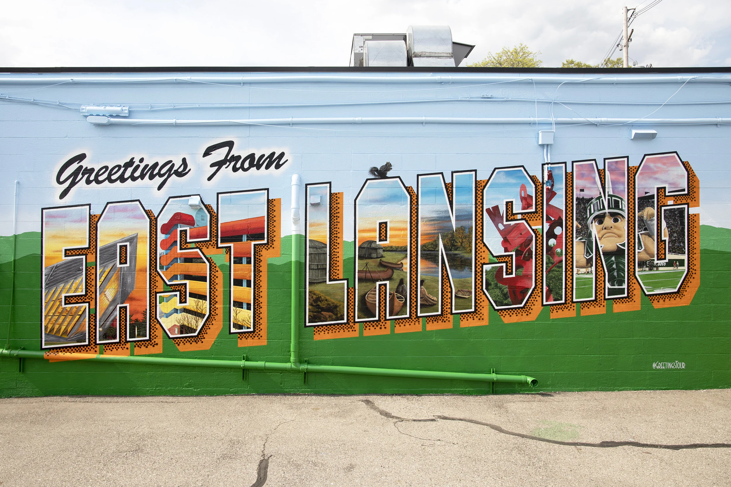 Greetings From East Lansing Michigan Postcard Mural Sign Street Art At Harrison Roadhouse Greetings Tour Postcard Mural Artists